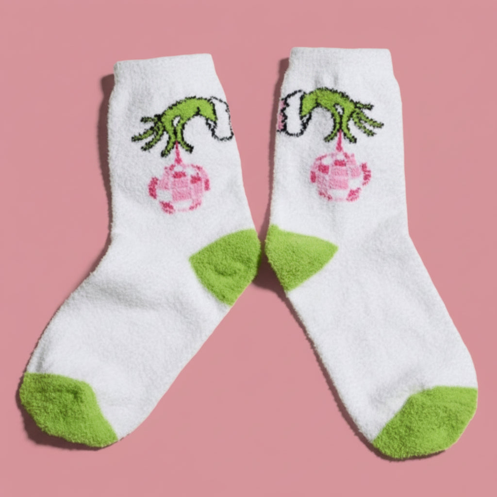Stay cozy and spread holiday cheer with this playful Grinch socks gift set. Featuring four pairs of fuzzy socks in festive designs, these 100% polyester socks are perfect! Whether you're relaxing at home or looking for a fun Christmas gift, these socks bring warmth and joy all season long.