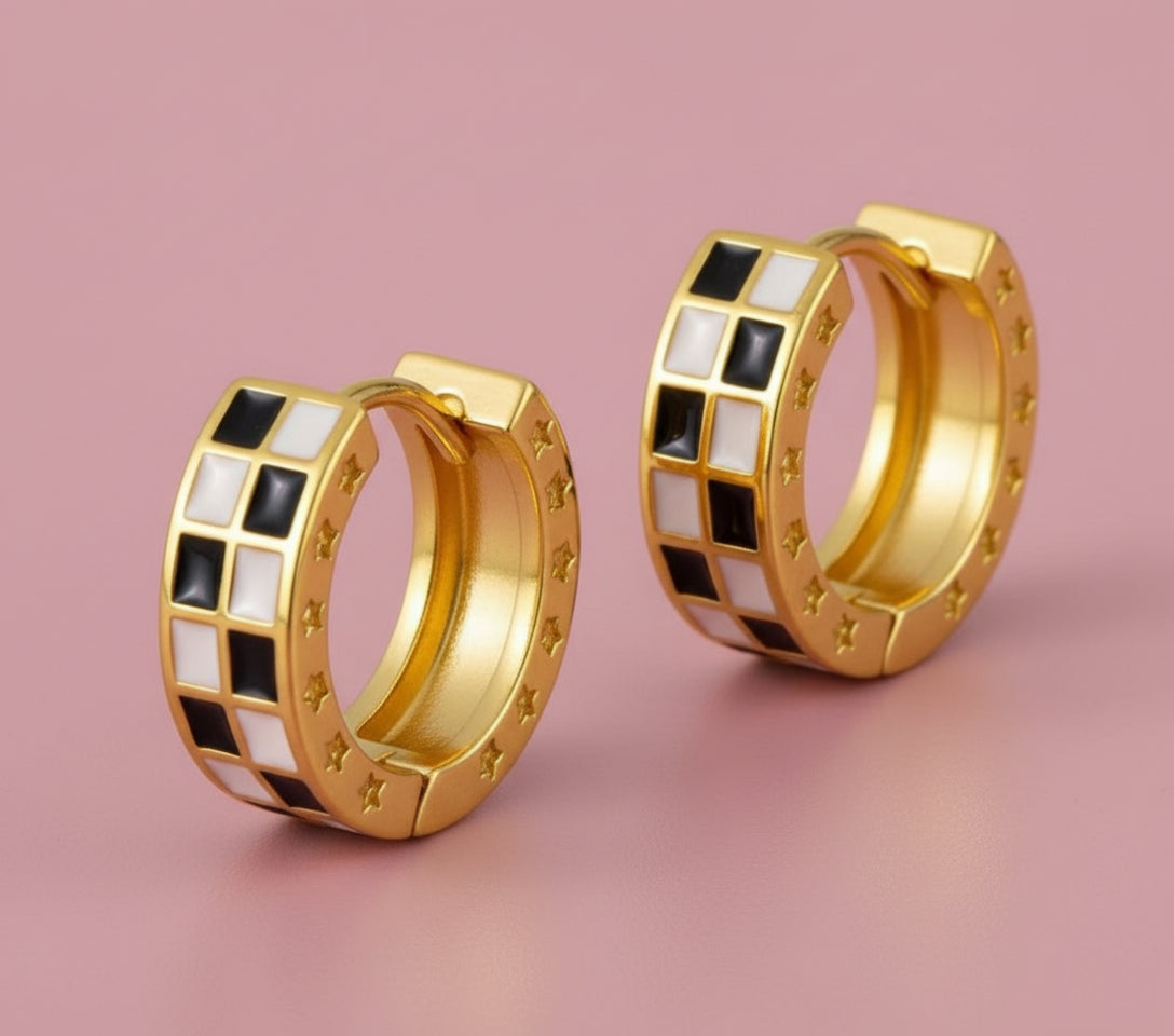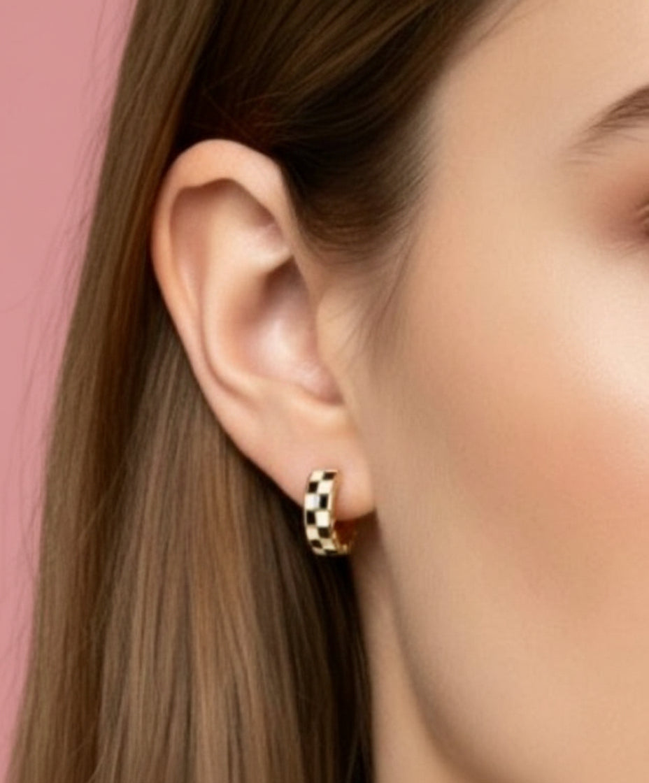 CHECKER BRASS HUGGIE HOOP EARRINGS SIZE: 0.5"