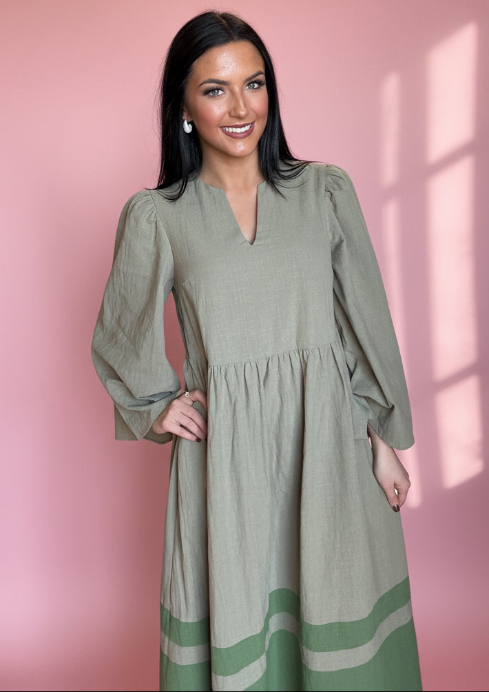 Elevate your holiday wardrobe with this stunning V-neck bell sleeve midi dress, featuring a chic color-blocked skirt in sage and olive green. The flattering silhouette combines a fitted bodice with graceful bell sleeves, while the two-tone skirt adds visual interest and modern flair. Perfect for festive gatherings, date nights, or any occasion calling for effortless elegance. These rich, earthy tones bring warmth and sophistication to your seasonal style. Material is 100% cotton.