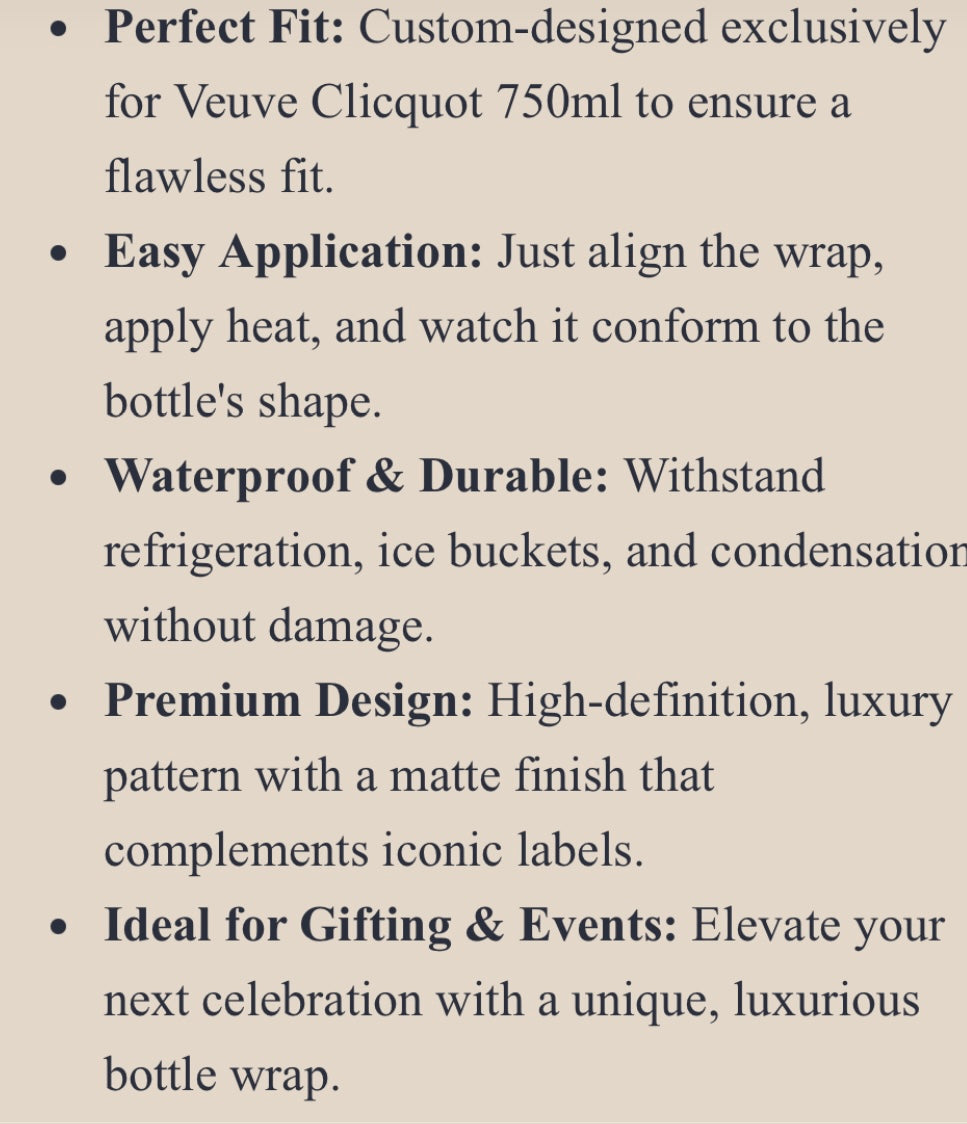 Carefully designed to fit Veuve Clicquot bottles but fit: