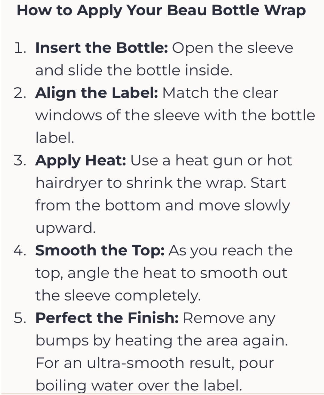 Transform your champagne bottles into an eye-catching masterpiece with our Beau Bottles wrap! Whether gifting or celebrating, this elegant wrap seamlessly blends with the bottle, adding a touch of sophistication to any occasion. Simply slip the wrap over the bottle, use a hair dryer or hot water to shrink it into place and enjoy a smooth, professional finish.