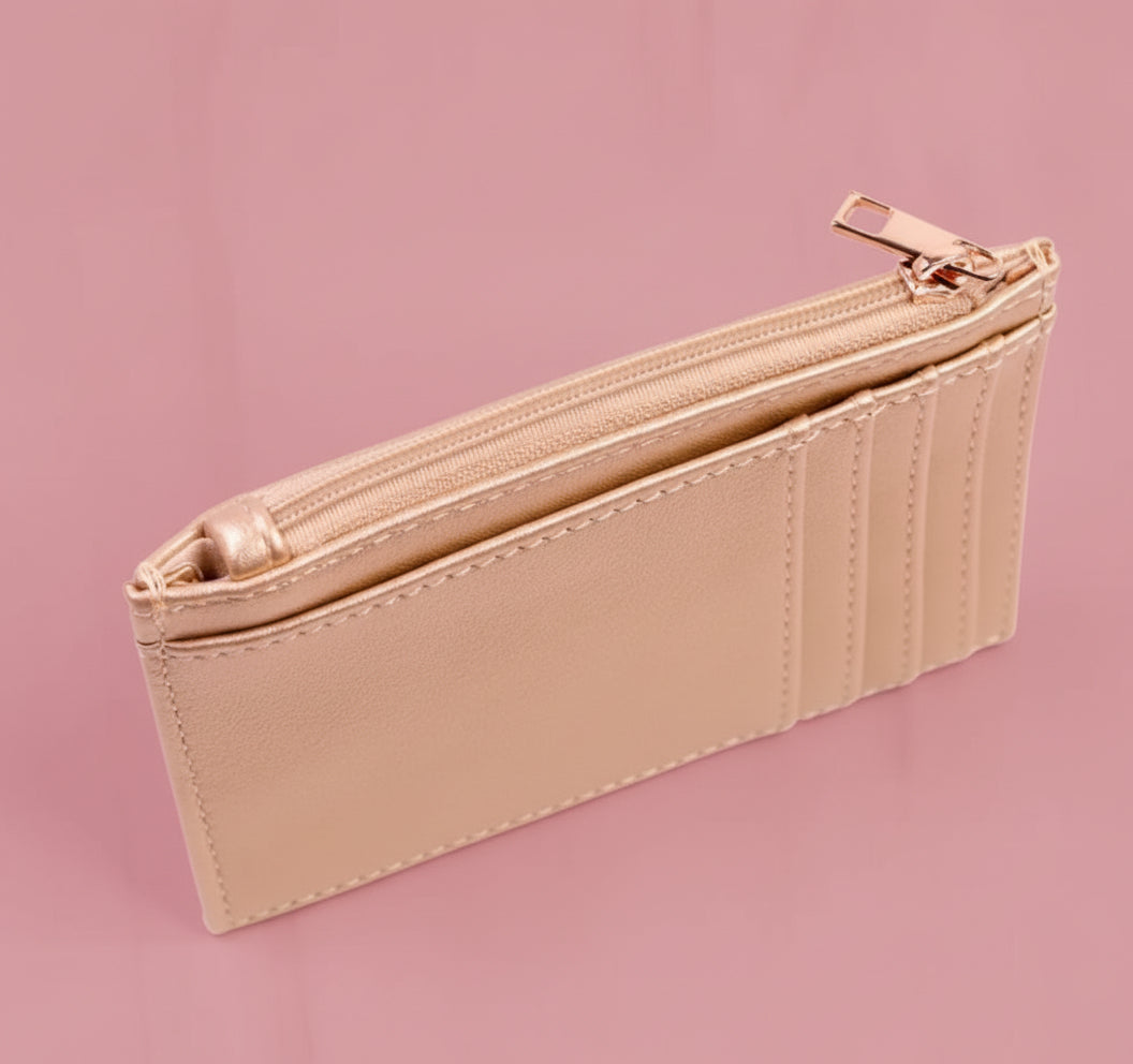 The Molly Zip Card Holder in Gold is a stylish and practical accessory designed for effortless organization. Featuring cardholders on both the front and back, plus a secure zip pocket in the center, it keeps your essentials neatly arranged while complementing your fashionable look. Perfect for those who value both function and chic simplicity.