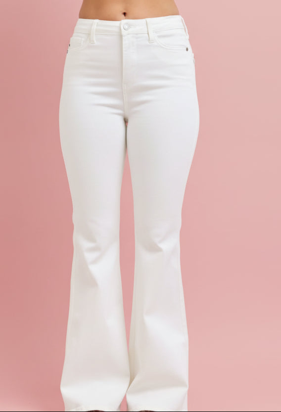 Flare up your spring wardrobe with Judy Blue's HW Tummy Control Flare in crisp white. These high-waist beauties feature built-in tummy control that smooths and flatters, paired with a floor-grazing flared hem for effortless style. The soft cotton-blend fabric (91% cotton, 6% poly, 3% spandex) hugs your curves while moving with you, delivering all-day comfort without compromise. Perfect for casual outings or dressed-up occasions, these jeans are your new go-to.