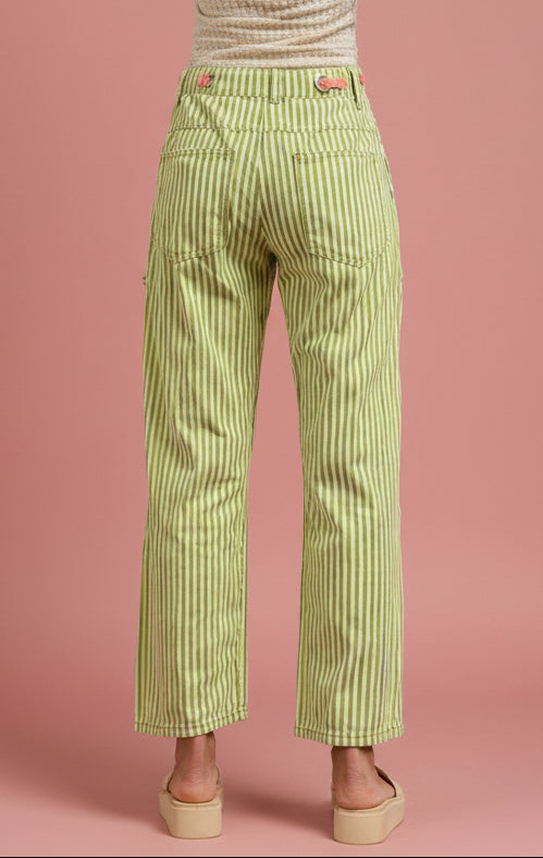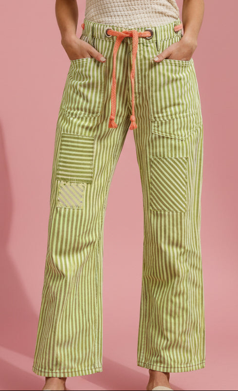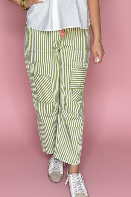 Step into style with these striped twill barrel pants in vibrant lime! The relaxed barrel leg silhouette pairs perfectly with practical cargo pockets and classic front and back pockets for all your essentials. A charming braided belt threads through grommets at the waist, adding a fun, personalized touch to your look. Complete with a secure button closure, these pants are your new go-to for effortless, playful everyday wear.