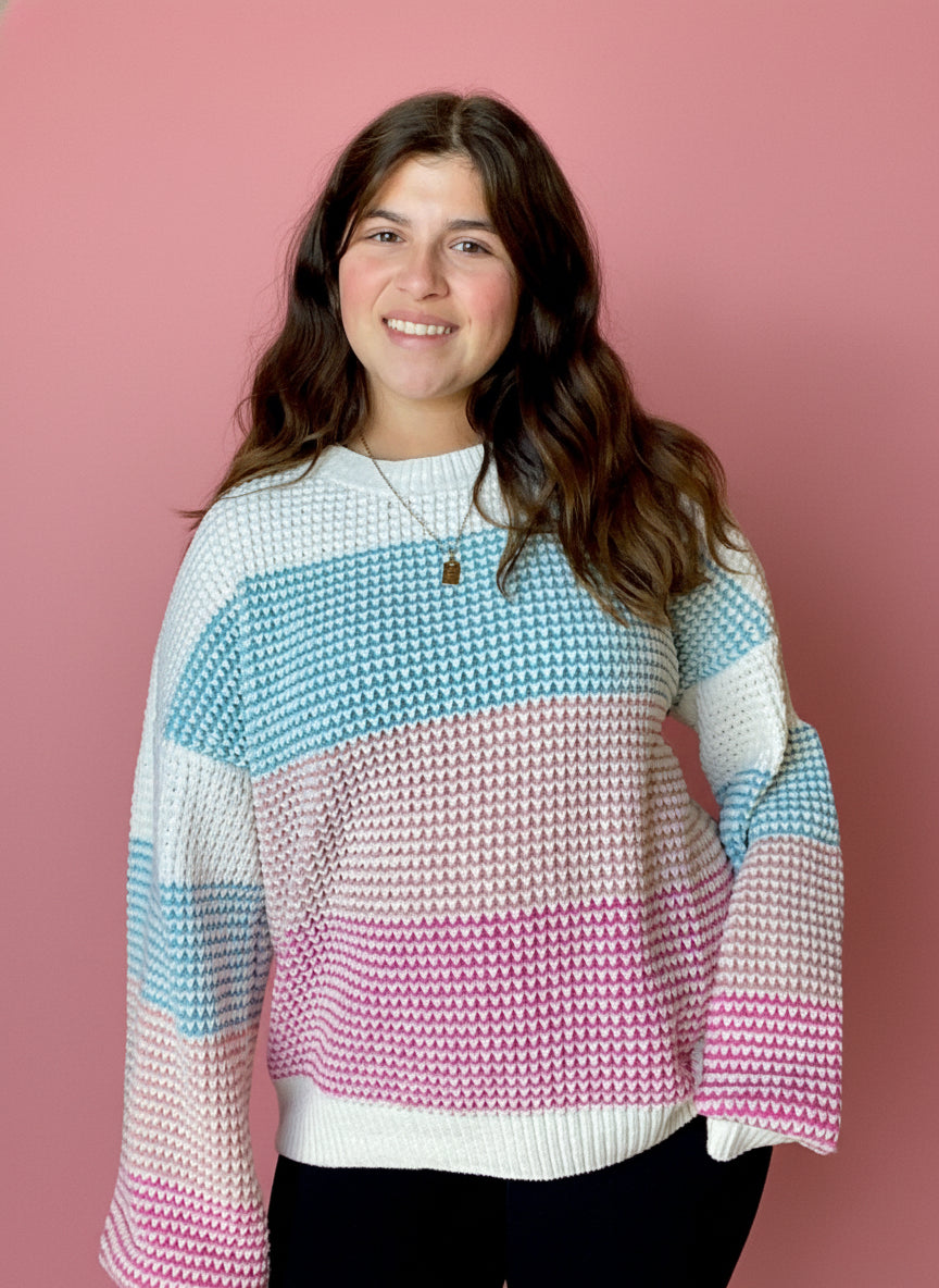 Layer up in this oversized color block knit sweater that's equal parts cozy and fun. Featuring a playful mix of pink, coral, aqua, and cream stripes, it's designed with a relaxed drop shoulder silhouette and round neckline for effortless style. Long sleeves and ribbed hem keep everything in place while you stay warm. Perfect for casual days when you want to make a cheerful statement.